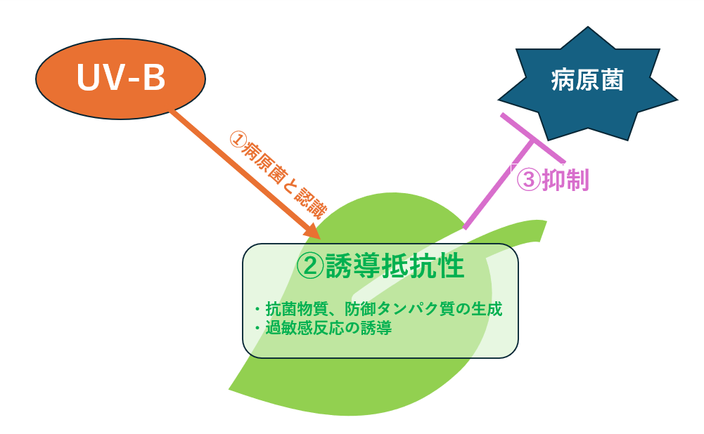 植物は、紫外線(特にUV-B領域)を浴びると、それを病原菌の接近を知らせる合図として捉え、実際に病原菌に感染する前から、抗菌物質や防御タンパク質などを体内で作り始めます。