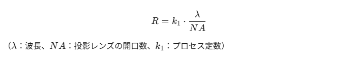 半導体の微細化が進む中、転写できるパターンの最小寸法(解像度)は、使用する光の波長に依存します。光学的な解像度 Rは、以下のレイリーの式で定義されます。